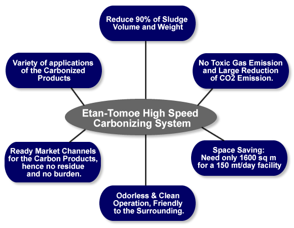 The advanced "High Speed Wastewater Sludge Carbonizing Process" offers by far the best solution to manage sewage wastewater sludge. It decomposes all the organic materials inside the sludge except the carbon, by heating the sludge at high temperature under no oxygen or with low oxygen condition. Flammable gases formed by hydrocarbons, is produced. The water in the sludge and some of heavy metals such as mercury (Hg) will be vaporized by the heat generated from the combustion of the flammable gases.